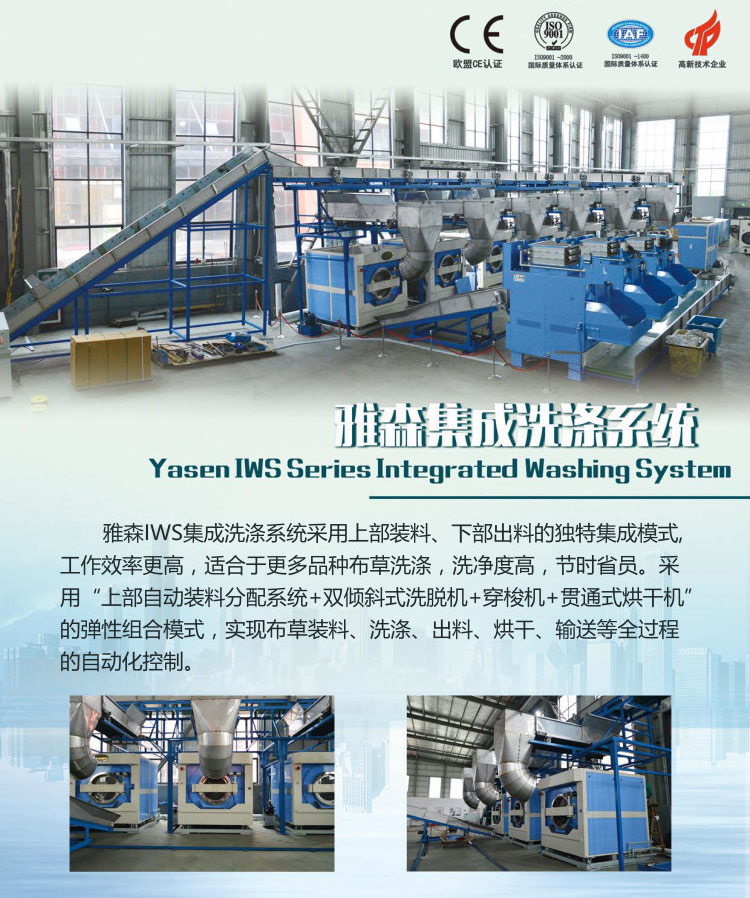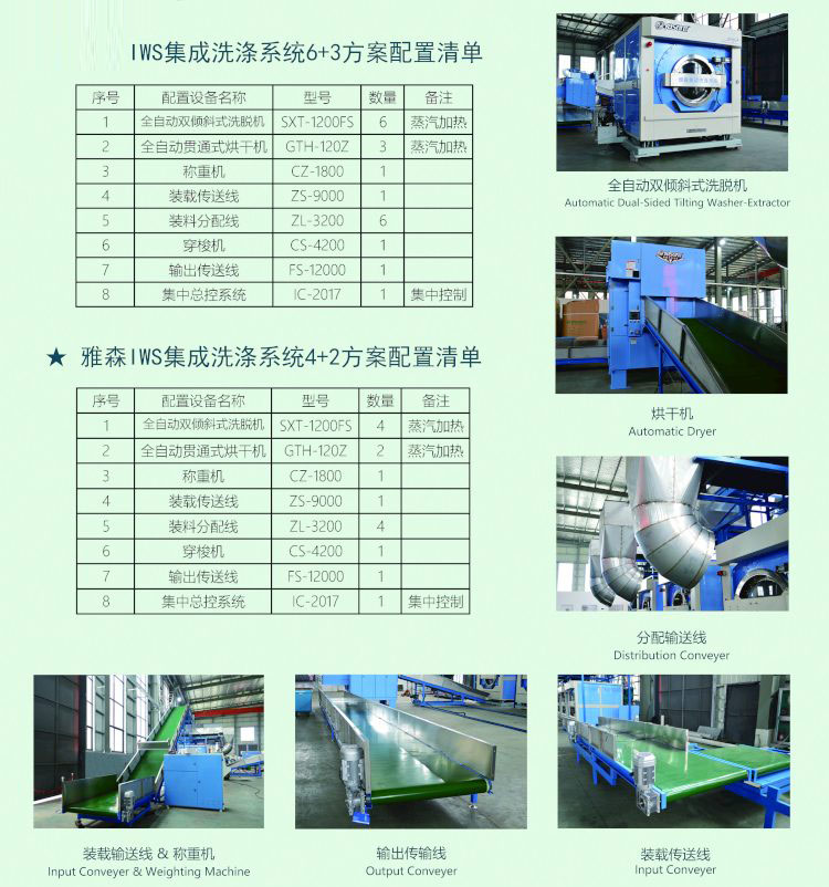 一、集成設備為高端5星級大酒店,大型水洗廠,大型三甲醫(yī)院和洗滌質(zhì)量要求很高,又需要高速、高效、節(jié)能、省時、省人工大規(guī)模洗滌的高端客戶專業(yè)設計制造。具有快速自動進料與自動快速傾斜出料功能。
